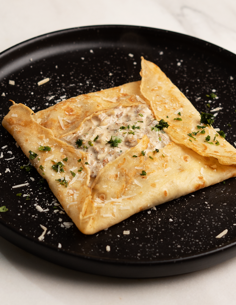 Pour the mixture over a warm cooked crepe and fold the crepe to seal it from all four sides, creating a pocket.