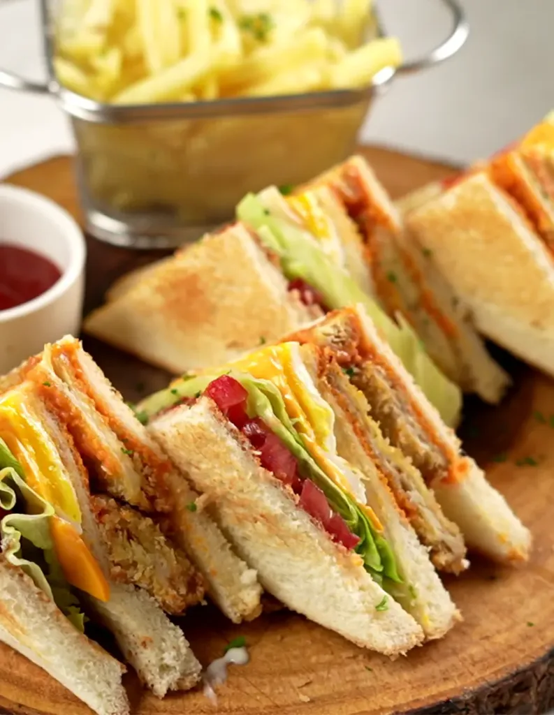 Close the sandwich with the third slice and cut into 4 equal pieces.