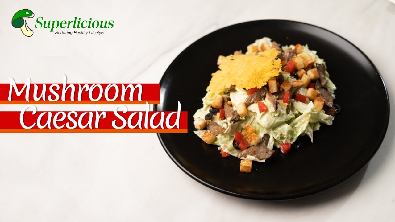 Complete the salad by topping it with a delightful combination of grey oyster mushrooms, olives, tomatoes, croutons, and Parmesan cheese croutons.