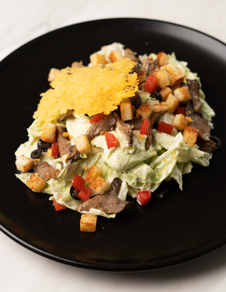 Complete the salad by topping it with a delightful combination of grey oyster mushrooms, olives, tomatoes, croutons, and Parmesan cheese croutons.